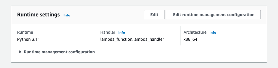 In you Lambda function, scroll to Runtime settings and click Edit: