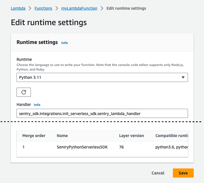 After saving, open the "Configuration" tab of your Lambda Function and set SENTRY_INITIAL_HANDLER to the handler you noted before: